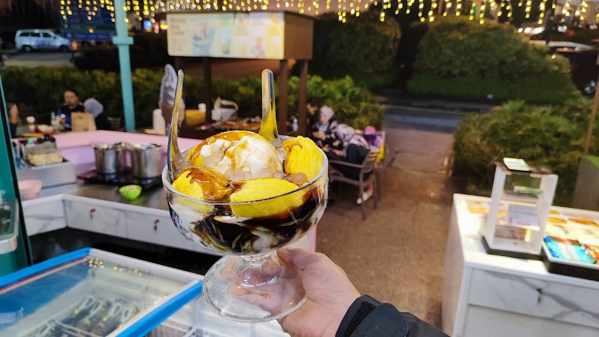 The real draw here is the durian-centric offerings, including D24 and Musang King varieties served in cendol or outright as fresh fruit, which capture the strong local preference for durian despite some inconsistencies in quality noted on occasion. Alongside the distinctive durian desserts, there are straightforward snacks like freshly fried French fries and casual mains such as Maggi Tomyam that tend to please those looking for a quick, warm bite in cooler weather. The food beyond the desserts leans toward the basic side—fine for a quick fix but not the main reason most visitors come here.